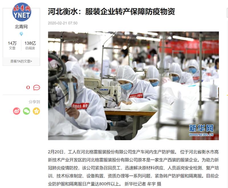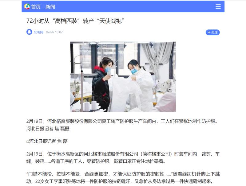十萬級潔凈車間的建成對于河北格雷來說是具有跨越式意義的一大步,從2月初疫情爆發時期的臨危援命、快速轉產到如今的十萬級無菌車間的建成投產,從之前的隔離衣、手術衣到現在的無菌防護服,河北格雷一直在與時間賽跑,力求以最快速度承擔更多責任,不負各界信任與托付。